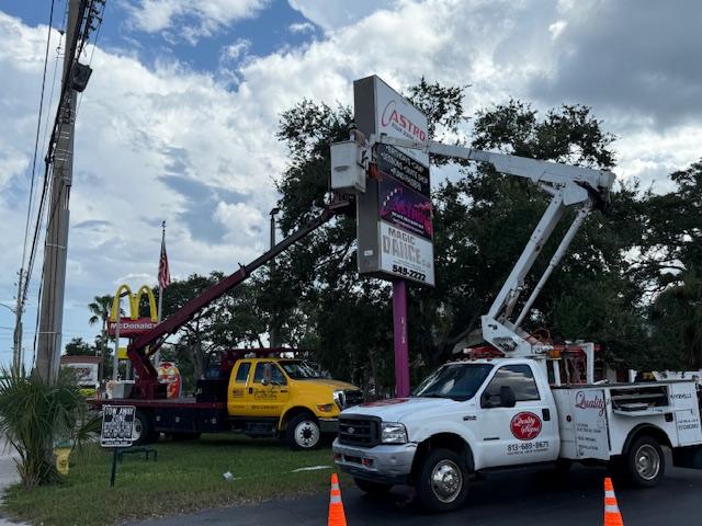 Dedicated In-House Installation Crew: Your sign is installed by our own team—experienced, professional technicians who work for Quality Signs Tampa. This means the people who install your sign are the same people who know exactly how it was fabricated and what it takes to mount it perfectly and safely. Fully Equipped Fleet: We maintain a complete fleet of installation vehicles, including crane and bucket trucks, specifically equipped for all types of large-scale and high-reach commercial sign projects. This means we control the schedule, the equipment, and the quality, ensuring your installation is completed efficiently and on time. Licensed Sign Contractor: We are a fully licensed and insured sign contractor. This critical credential gives you peace of mind, assuring that all work adheres to local codes, safety regulations, and industry best practices. Don't risk your project with an unlicensed vendor—our full insurance coverage protects you and your business from start to finish. Zero Subcontracting: We eliminate the risks and added costs associated with subcontracting. By never farming out the work, we cut out the middle-man, which allows us to provide shorter lead times and the most competitive prices on your complete sign package—from design and fabrication to final installation. Trust the experts at Quality Signs Tampa to not only manufacture a beautiful, high-quality sign but to also install it flawlessly, safely, and legally. Our dedicated crew and fleet are ready to get your business noticed.